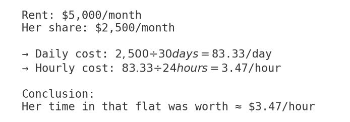 The rent for the flat was around $5,000 a month. Her half? About $2,500. Divide that by 30 days, then by 24 hours, and her time in that apartment was worth just $3.50 an hour.